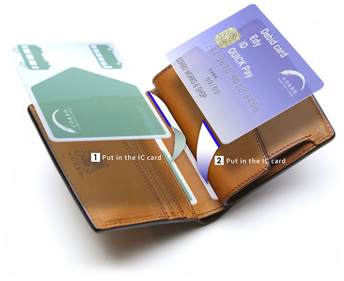 「カード段背面」「コインケース背面」にそれぞれICカードを入れることで、外面からそれぞれ財布を開かず利用が出来ます。